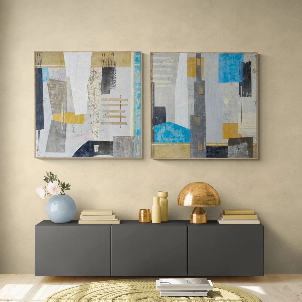 Diptych, 2 of 2. Layered mixed media and acrylics on canvas